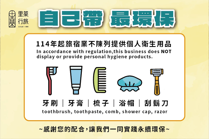 114年1月1日起,旅宿業不陳列及主動提供個人衛生用品(拋棄式備品),有牙刷、牙膏、梳子、浴帽、刮鬍刀。